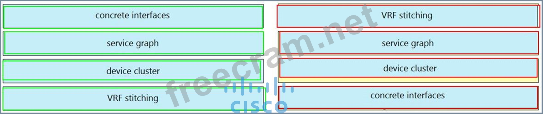 Drag and drop the Cisco ACI Layer 4 to Layer 7 service insertion terms on the left to the correct descriptions on the right.