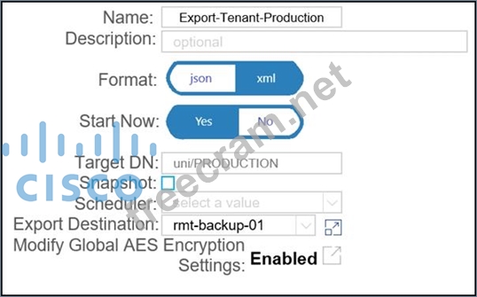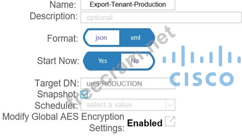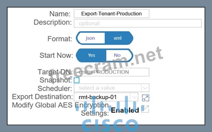 A network engineer must backup the PRODUCTION tenant. The configuration backup should be stored on the APIC using a markup language and contain all secure information. Which export policy must be used to meet these requirement? A) B) C) D)