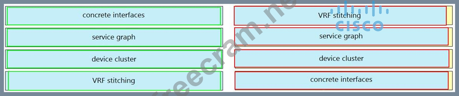 Drag and drop the Cisco ACI Layer 4 to Layer 7 service insertion terms on the left to the correct descriptions on the right.