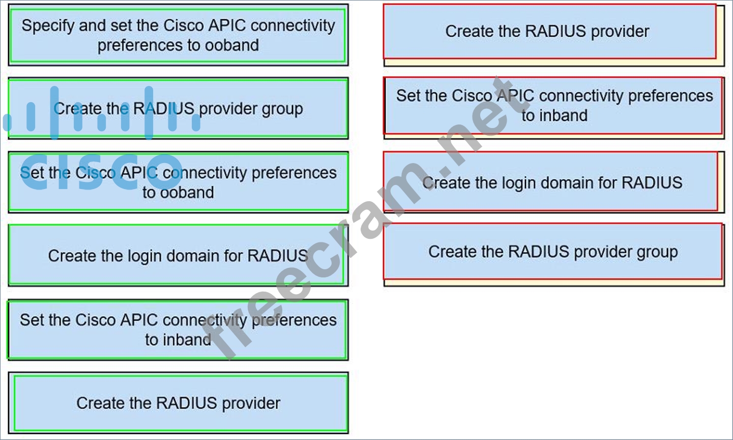 An engineer must configure RADIUS authentication with Cisco ACI for remote authentication with out-of-band management access. Drag and drop the RADIUS configuration steps from the left into the required implementation order on the right. Not all steps are used.