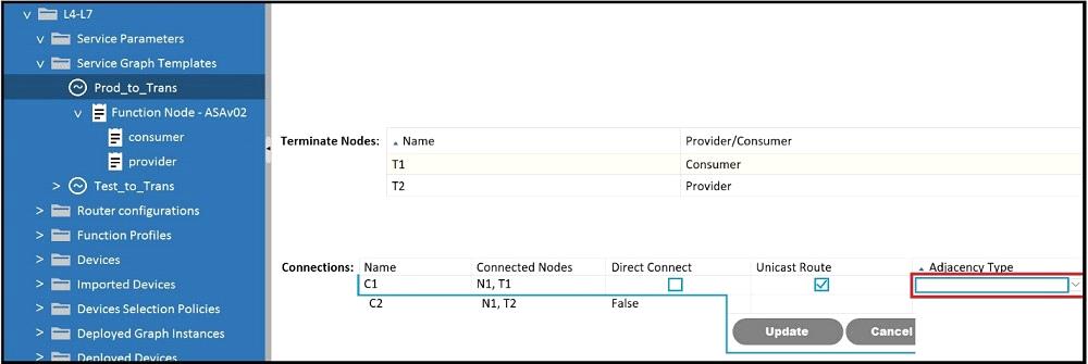 Which Adjacency Type value should be set when the client endpoint and the service node interface are in a different subnet?