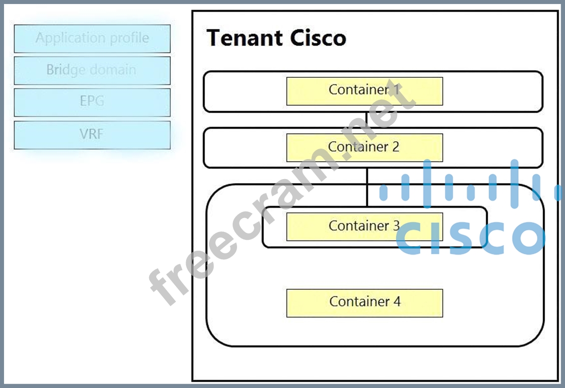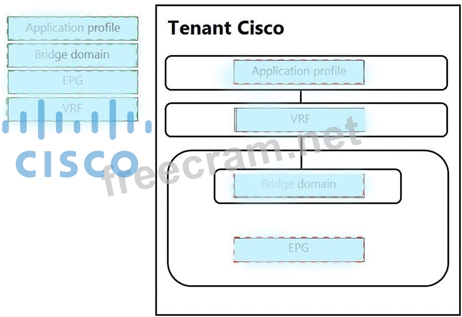 An engineer is configuring a VRF for a tenant named Cisco. Drag and drop the child objects on the left onto the correct containers on the right for this configuration.