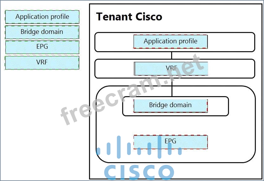 An engineer is configuring a VRF for a tenant named Cisco. Drag and drop the child objects on the left onto the correct containers on the right for this configuration.