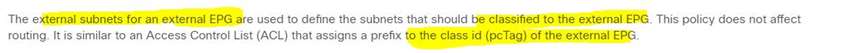An engineer must allow multiple external networks to communicate with internal ACI subnets. Which action should the engineer take to assign the prefix to the class ID of the external Endpoint Group?