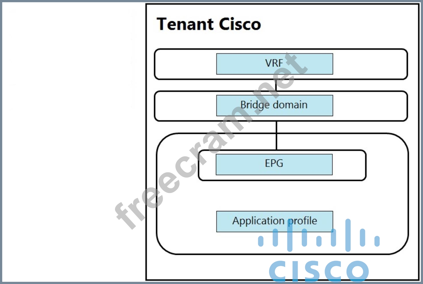 An engineer is configuring a VRF for a tenant named Cisco. Drag and drop the child objects on the left onto the correct containers on the right for this configuration.