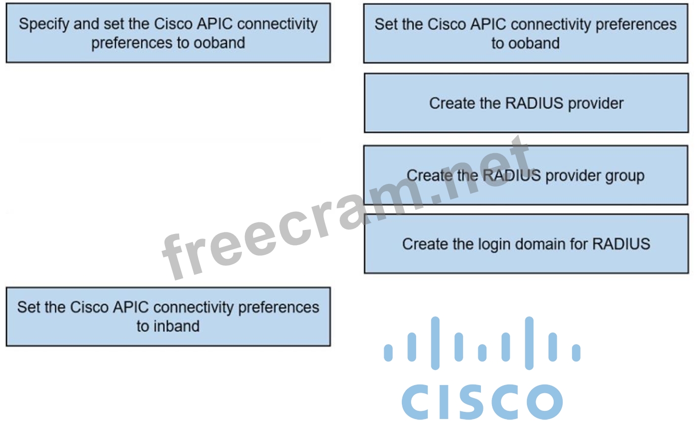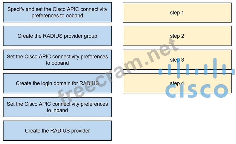 An engineer must configure RADIUS authentication with Cisco ACI for remote authentication with out-of-band management access. Drag and drop the RADIUS configuration steps from the left into the required implementation order on the right. Not all steps are used.