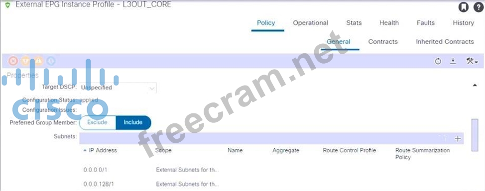 Refer to the exhibit. An engineer configured subnets on the external EPG called L3OUT_CORE.