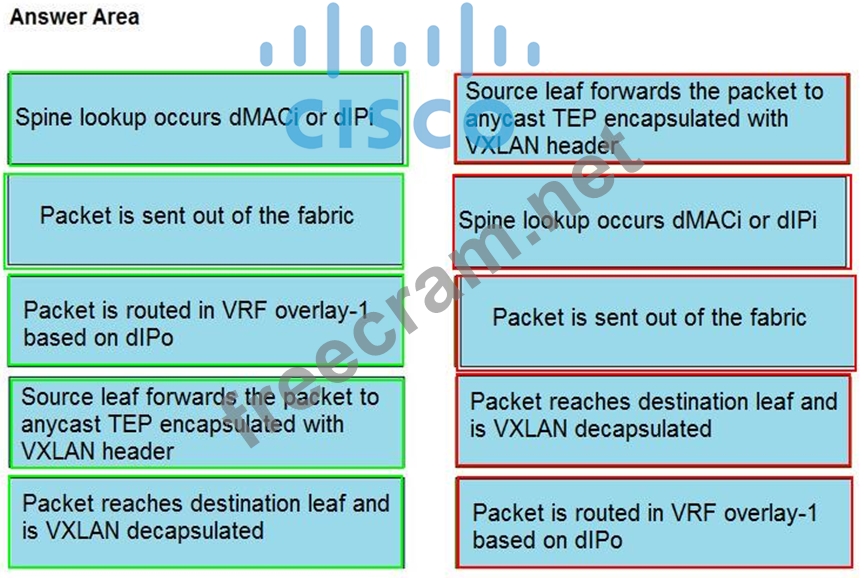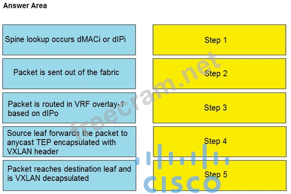 A leaf receives unicast traffic that is destined to an unknown source, and spine proxy is enabled in the corresponding bridge domain. Drag and drop the Cisco ACI forwarding operations from the left into the order the operation occurs on the right.