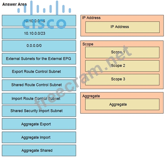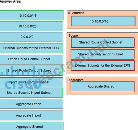 Refer to the exhibit. Drag and drop the subnets and flags from the left into the External Network Instance Profile policies on the right to create a setup that advertises only 10.10.0.0/24 and 10.10.1.0/24 prefixes in VRF1 and establishes connectivity between VRFs. Not all options are used.