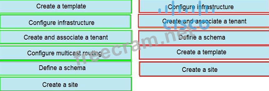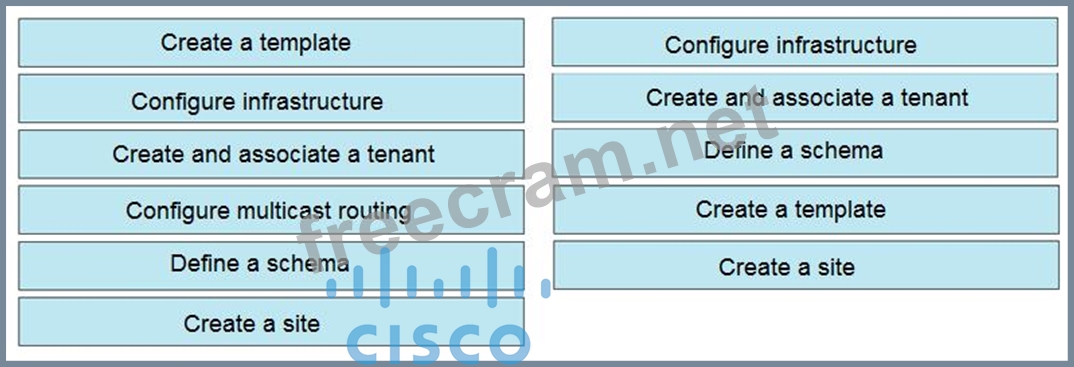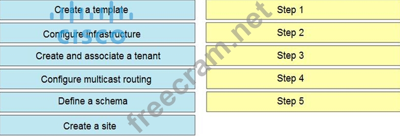 F- Create a site B- Configure Infrastructure D- Configure multicast routing E- Define a schema C- Create and associate a tenant A- Create a template