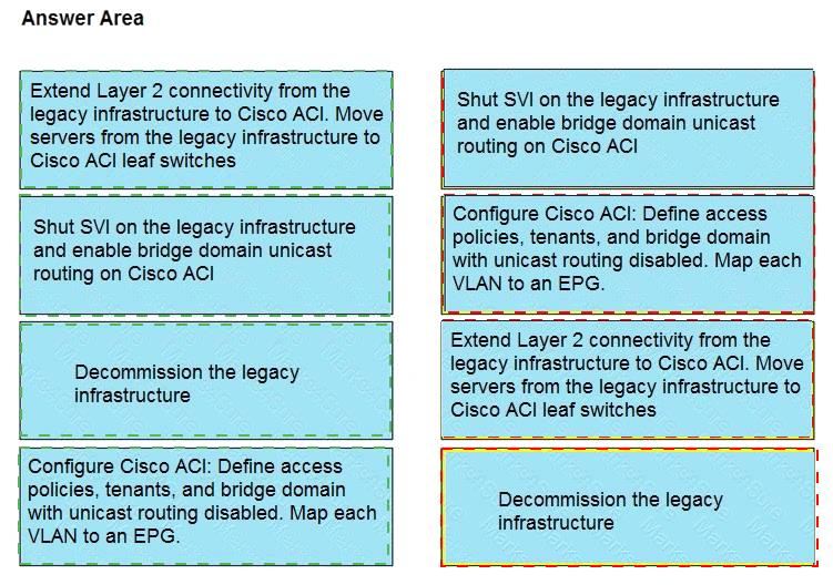 An engineer must migrate servers from a legacy data center infrastructure to a Cisco ACI fabric. Drag and drop the steps from the left into the order that they must be completed on the right to ensure the least amount of downtime.