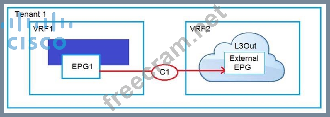 Refer to the exhibit. An engineer must have communication between EPG1 in VRF1 and External EPG in VRF2. Which three actions should be taken for the defined subnets in the L3Out External EPG to accomplish this goal? (Choose three.)
