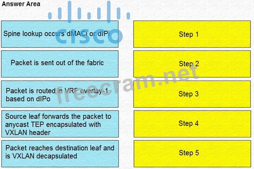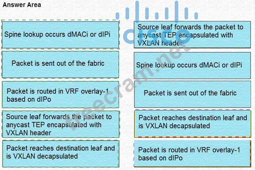 A leaf receives unicast traffic that is destined to an unknown source, and spine proxy is enabled in the corresponding bridge domain. Drag and drop the Cisco ACI forwarding operations from the left into the order the operation occurs on the right.