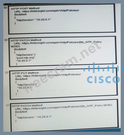Exhibit: Refer to the exhibit. Cisco Instersight has an NTP server policy called My_NTP_Policy configured that contains a single NTP server pool entry "pool.ntp". Which Cisco Intersight API call adds an additional NTP server (10.20.0.1) to the My_NTP_Policy server policy?