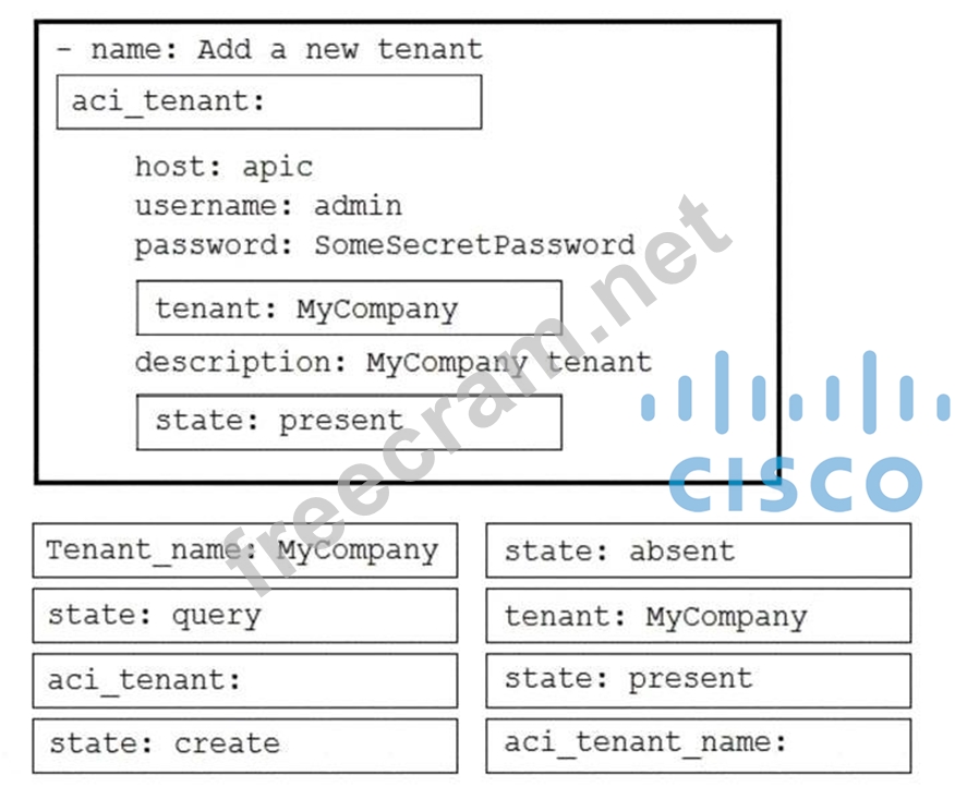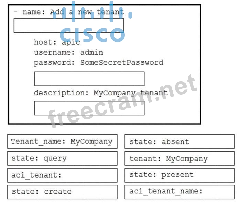 Drag and drop the code to complete an Ansible playbook that creates a new tenant. Not all options are used.