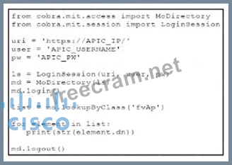 Refer to the exhibit. A Python script using ACI Cobra SDK has been constructed. What is the result when running this script?