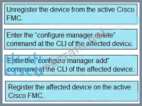 Drag and drop the steps to restore an automatic device registration failure on the standby Cisco FMC from the left into the correct order on the right. Not all options are used.
