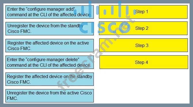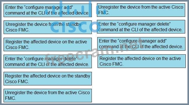 Drag and drop the steps to restore an automatic device registration failure on the standby Cisco FMC from the left into the correct order on the right. Not all options are used.