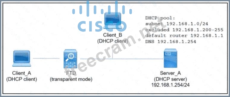 Refer to the exhibit. An engineer is deploying a new instance of Cisco Secure Firewall Threat Defense. Which action must the engineer take next so that Client_A and Client_B receive an IP address via DHCP from Server_A?