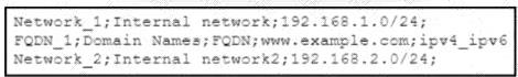 Refer to the exhibit. An engineer must import three network objects into the Cisco Secure Firewall Management Center by using a CSV file. Which header must be configured in the CSV file to accomplish the task?