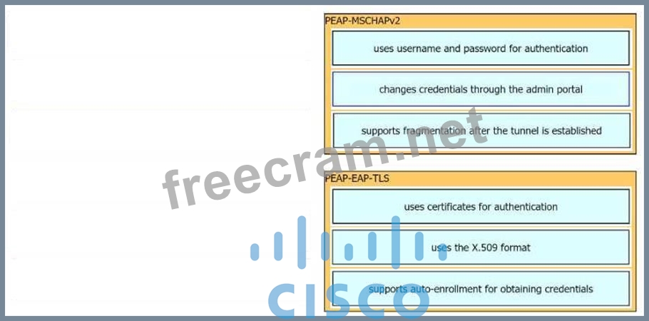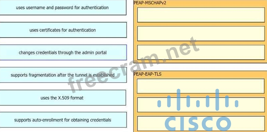 An organization wants to implement 802.1X and is debating whether to use PEAP-MSCHAPv2 or PEAP-EAP-TLS for authentication. Drag the characteristics on the left to the corresponding protocol on the right.