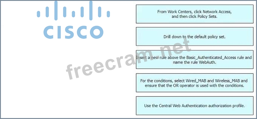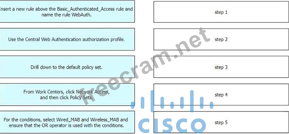 Refer to the exhibit. An engineer must create a web authentication access policy in Cisco ISE that matches the exhibit. Drag and drop the configuration steps from the left into sequence on the right to accomplish this task.