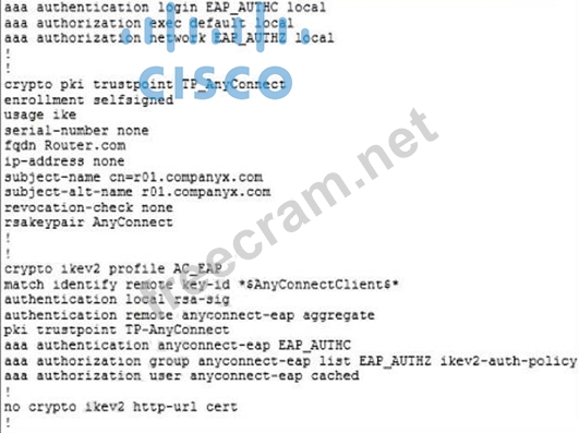 In the given configuration, the trustpoint TP_AnyConnect is using a self-signed certificate (enrollment selfsigned). When using Cisco Secure Client (formerly AnyConnect) with IKEv2, the client expects a valid, trusted certificate issued by a Certificate Authority (CA). Since self-signed certificates are not trusted by default, the client may reject the connection, causing the VPN tunnel to fail. To resolve this issue, the engineer should: 1. Obtain and install a trusted CA-signed certificate on the router. 2. Update the crypto pki trustpoint configuration to use the new certificate. 3. Ensure the certificate Common Name (CN) and Subject Alternative Name (SAN) match the VPN gateway's FQDN.