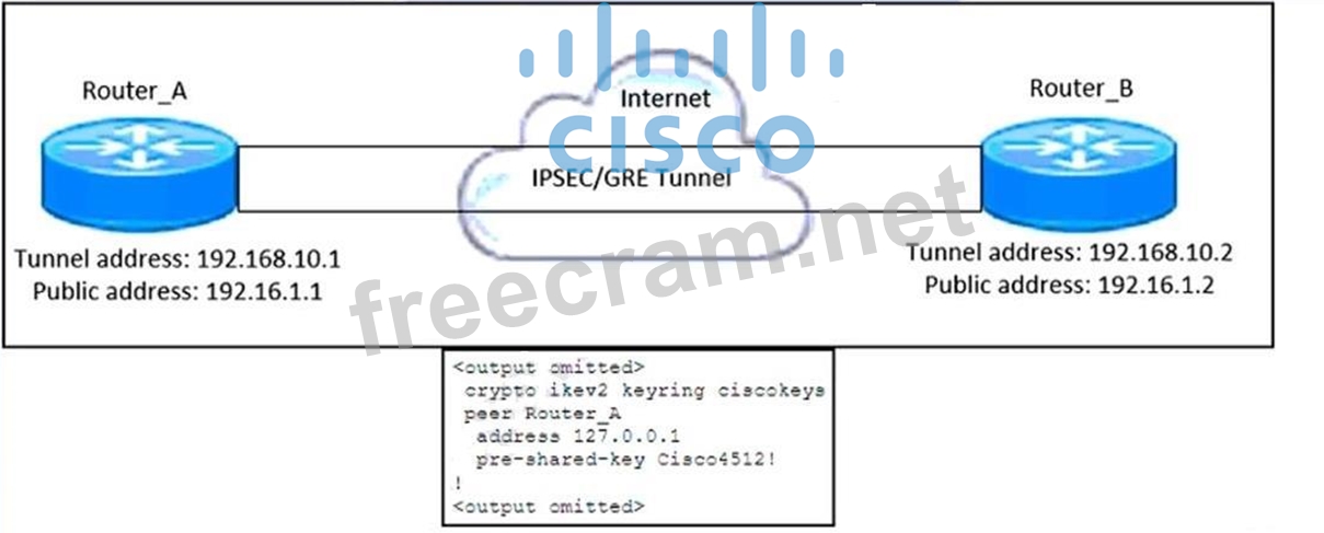 The configuration snippet on Router_A shows an IKEv2 keyring entry for Router_B with the following line: peer Router_B address 127.0.0.1 pre-shared-key Cisco4512! The issue is that 127.0.0.1 (loopback address) is incorrectly used as the peer address, which prevents IKE negotiation. In a FlexVPN site-to-site GRE tunnel over IPsec, the peer address must be set to the public IP address of the remote router. In this case, Router_B's public IP address is 192.16.1.2.