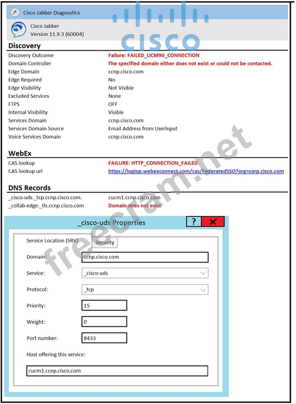 Users connected to the internal network report a "Cannot communicate with the server" error while trying to log in to Cisco Jabber using auto service discovery. The Jabber diagnostics and the SRV record configuration are as shown in the exhibit. The host cucm1.ccnp.cisco.com is correctly resolved by the user desktops with the Cisco Unified Communications Manager IP address. Why is the user not able to log in?