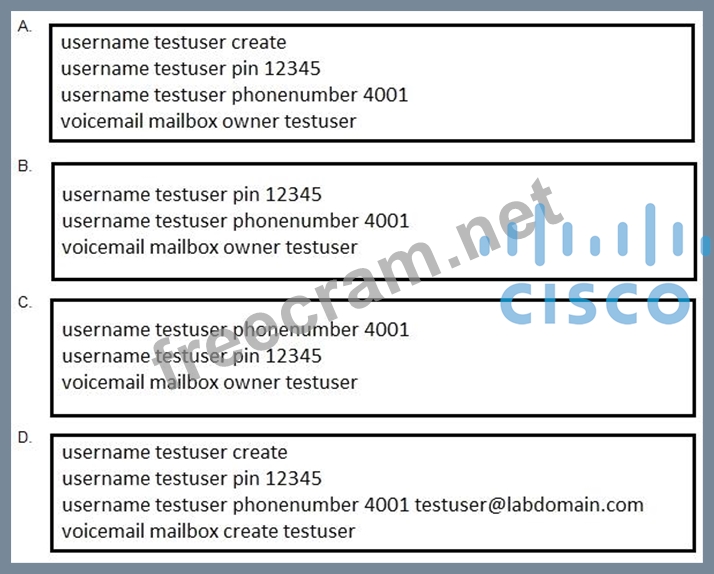 An engineer must configure a test user mailbox in a newly deployed Cisco Unity Express module. Which console command set reflects the correct configuration in this scenario?