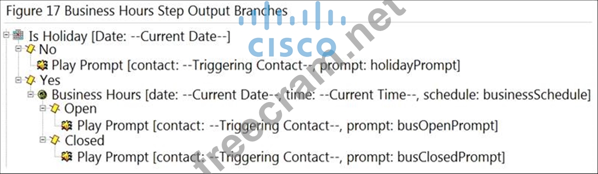 An administrator is configuring the auto-attendant script for a Cisco Unity Express integration to Cisco UCME and wants to play the "busOpenPrompt" wave file when it is not a holiday. How should the script be configured to accomplish this goal?