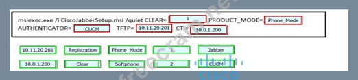 An engineer is configuring a Jabber client installation switch for a phone system using Cisco UCM as the registration server, with a softphone control address of 10.0.1.200. and configuration files received from 10.11.20.201 after all previous configurations are cleared. Drag and drop the snippets from the bottom of the image onto the blanks in the image to complete this configuration. Not all options are used.