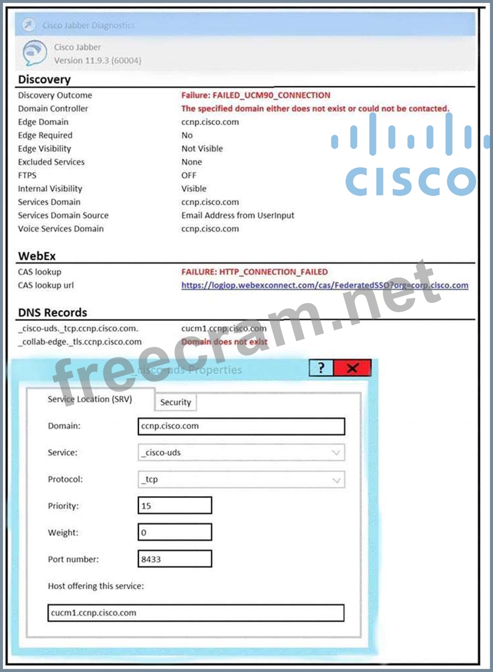 Users connected to the internal network report a "Cannot communicate with the server" error while trying to log in to Cisco Jabber using auto service discovery. The Jabber diagnostics and the SRV record configuration are as shown in the exhibit. The host cucm1.ccnp.cisco.com is correctly resolved by the user desktops with the Cisco Unified Communications Manager IP address. Why is the user not able to log in?