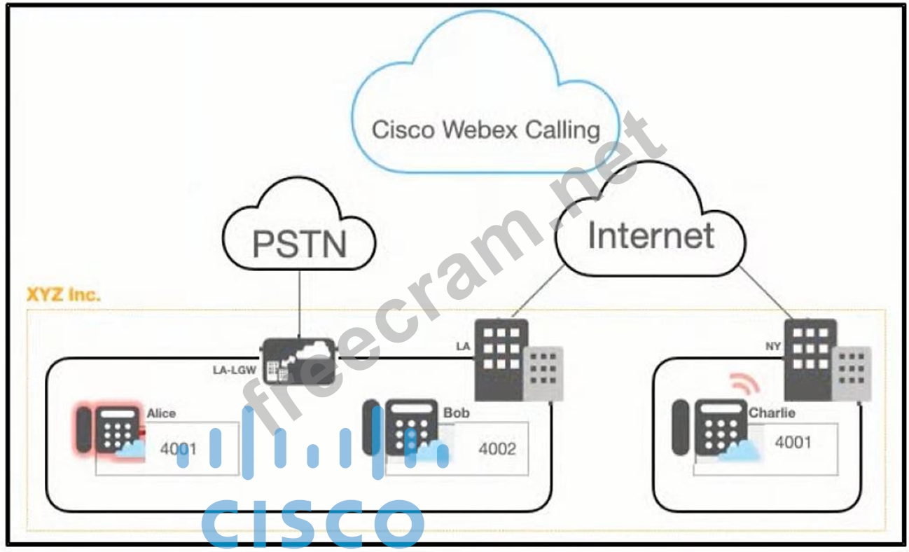 Refer to the exhibit. A company deployed the Cisco Webex calling with Cisco Unified Border Element as a local gateway for PSTN calls and a firewall to restrict and control the HTTP-based traffic that leaves and enters the network. However, Alice in LA cannot dial 82024001 to reach Charlie in NY. Which action must an administrator take to resolve the issue?