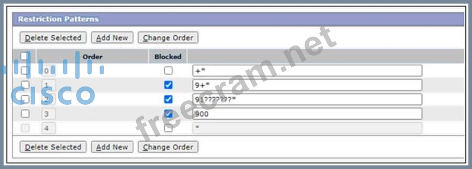 Refer to the exhibit. An engineer discovers that many international calls were made from Cisco Unity Connection. The engineer examines the default transfer Restriction Patterns. Which action prevents a voicemail user from transferring calls to international destinations?