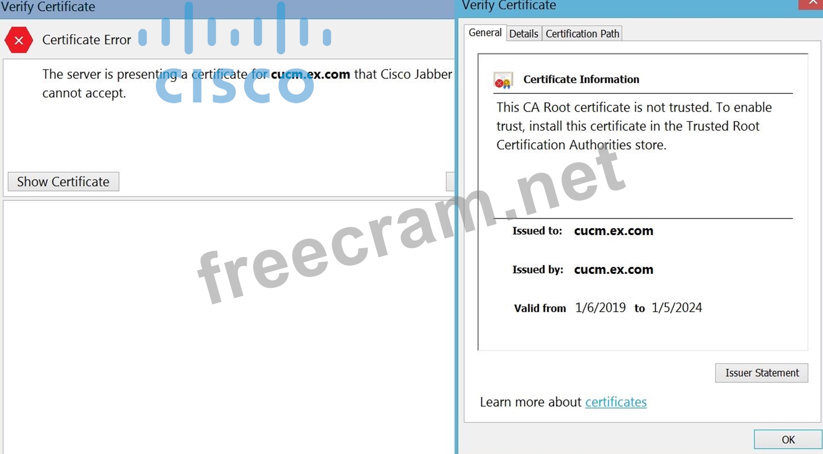 Refer to the exhibit. When troubleshooting an internal Jabber login problem, there is a pop-up about a certificate error, and then the login fails The FQDN of Cisco UCM is cucm.ex.com. and the FODN of the IM and Presence Server is imp.ex.com.