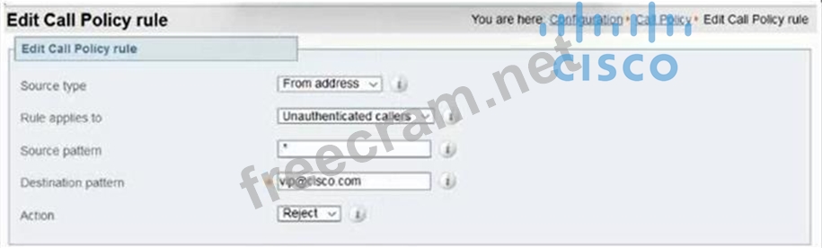 Refer to the exhibit. Call policy rules on an Expressway-E prevent external callers from the internet from calling a VIP whose URI is [email protected]. Which additional configuration setting is required for this call policy to function as intended?