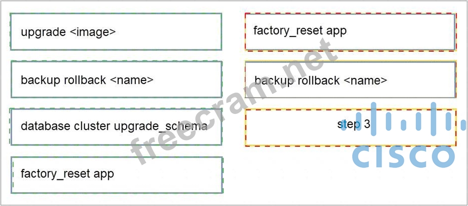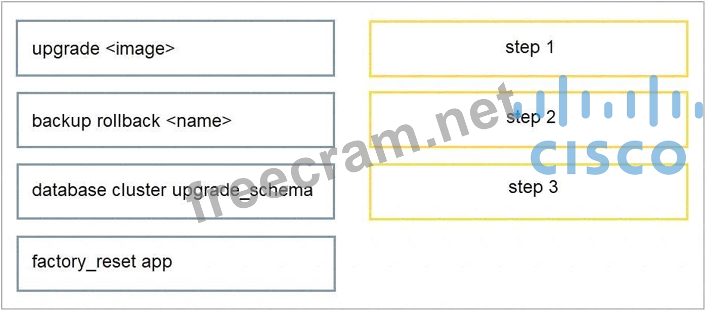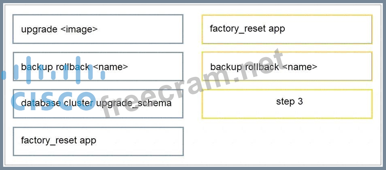 A Cisco Meeting Server administrator upgrades a cluster but encounters an issue that requires downgrading to a previous version. Drag and drop the MMP commands from the left into the order on the right to perform the downgrade. Not all options are used.