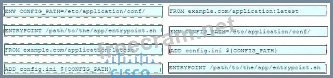 Drag and drop the entries from the left into the order on the right to create a Dockerfile that will accomplish this goal.