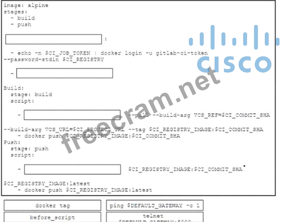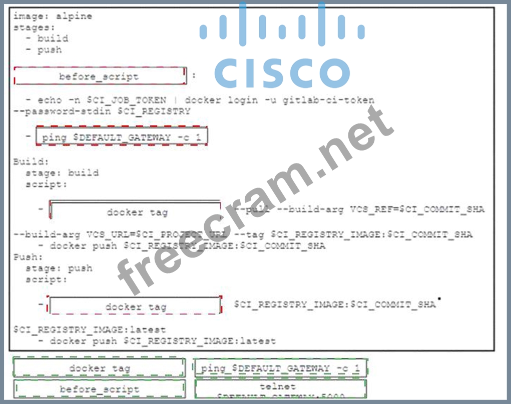 Drag and drop the code snippets from the bottom onto the boxes in the GitLab CI configuration to achieve the requirements for the design. Not all options are used.