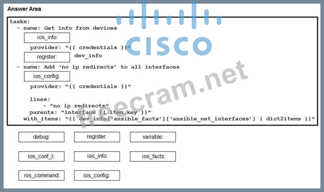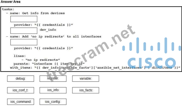Construct an Ansible script to gather information about target routers and then use it to apply no ip redirects to every interface on each device. Drag and drop the code from the bottom onto the correct location in the exhibit to complete the tasks section of the Ansible playbook so that it accomplishes your goal.