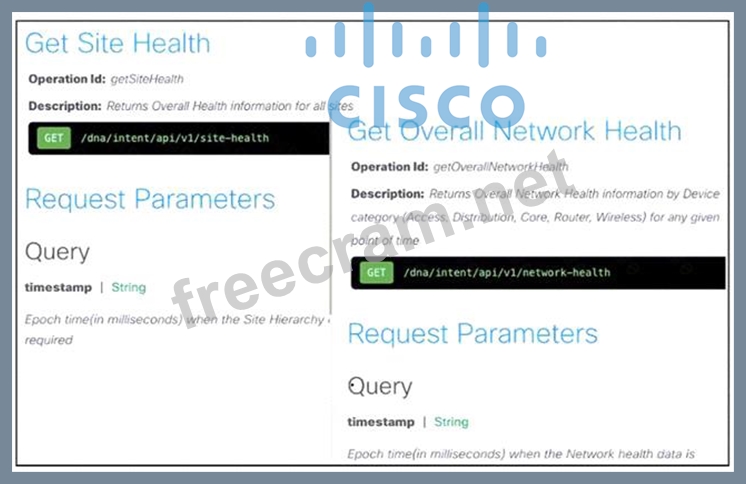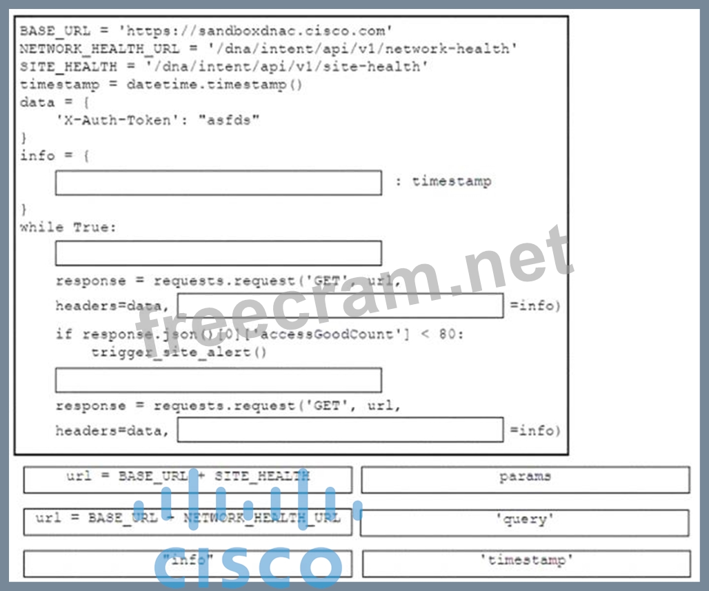 Drag and drop the code snippets from the bottom onto the blanks in the code to monitor the site and network health on a Cisco DNA Center platform instance. Options may be used more than once. Not all options are used.