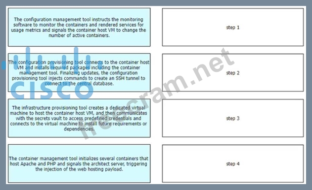 Refer to the exhibit. A containerized application that leverages a container host VM must be deployed. Drag and drop the events on the left onto their related steps on the right in order to describe the sequence behind the process.