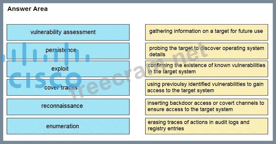 Drag and drop the phases to evaluate the security posture of an asset from the left onto the activity that happens during the phases on the right.