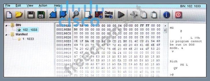 The other options, such as an MS-DOS executable archive or archived malware, are less specific and do not directly relate to the evidence presented in the file's resources. A Windows executable file would also have a DOS MZ header, but thequestion specifically asks about the indication from examining the file's resources, which points to the DOS MZ format. Therefore, the most accurate answer is A. a DOS MZ executable format.