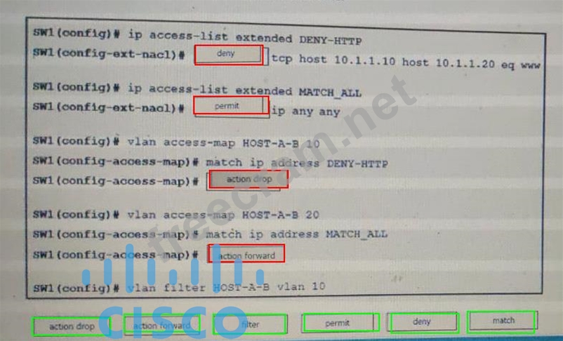 Refer to the exhibit. An engineer must deny HTTP traffic from host A to host V while allowing all other communication between the hosts, drag and drop the commands into the configuration to achieve these results. Some commands may be used more than once. Not all commands are used.