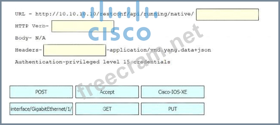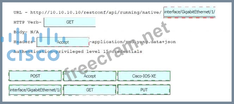 Refer to the exhibit Drag and drop the snippets into the RESTCONF request to form the request that returns this response Not all options are used