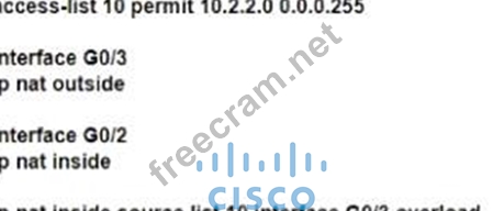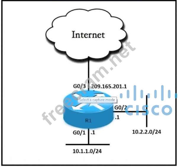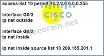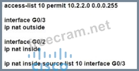 An engineer must allow all users In the 10.2.2.0/24 subnet to access the Internet. To conserve address space, the public interface address of 209.165.201.1 must be used for all external communication. Which command set accomplishes these requirements?