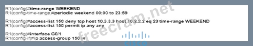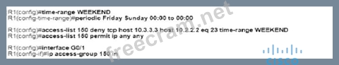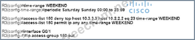 An engineer must deny Telnet traffic from the loopback interface of router R3 to the loopback interface of router R2 during the weekend hours. All other traffic between the loopback interfaces of routers R3 and R2 must be allowed at all times. Which command accomplish this task?