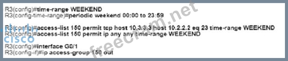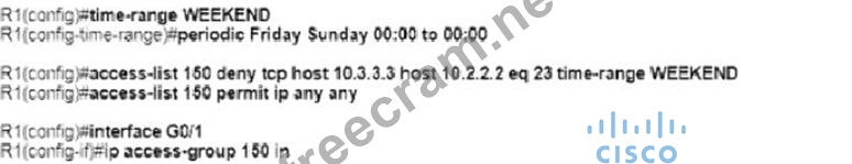 An engineer must deny Telnet traffic from the loopback interface of router R3 to the loopback interface of router R2 during the weekend hours. All other traffic between the loopback interfaces of routers R3 and R2 must be allowed at all times. Which command accomplish this task?